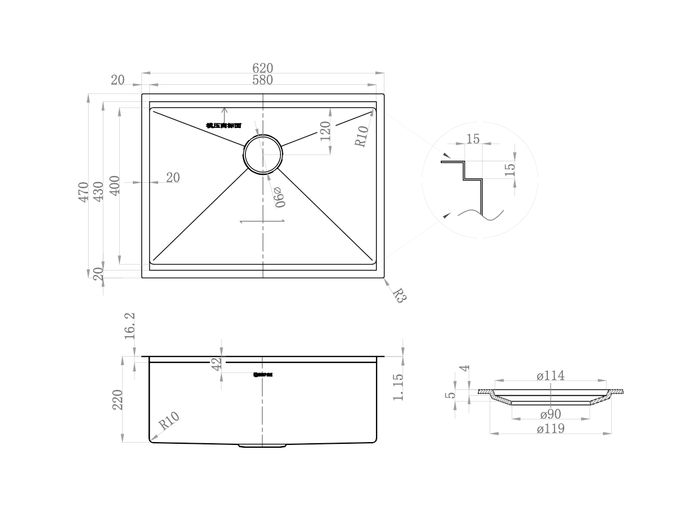 Brushed Finish High QualityTop/ Under Mount1.2mm 304 Grade Stainless SteelRadiused Corners for Easy CleaningIdeal for Kitchen ApplicationsBasket Wastes IncludedOuter Dimension 620 x 470 x 220mm